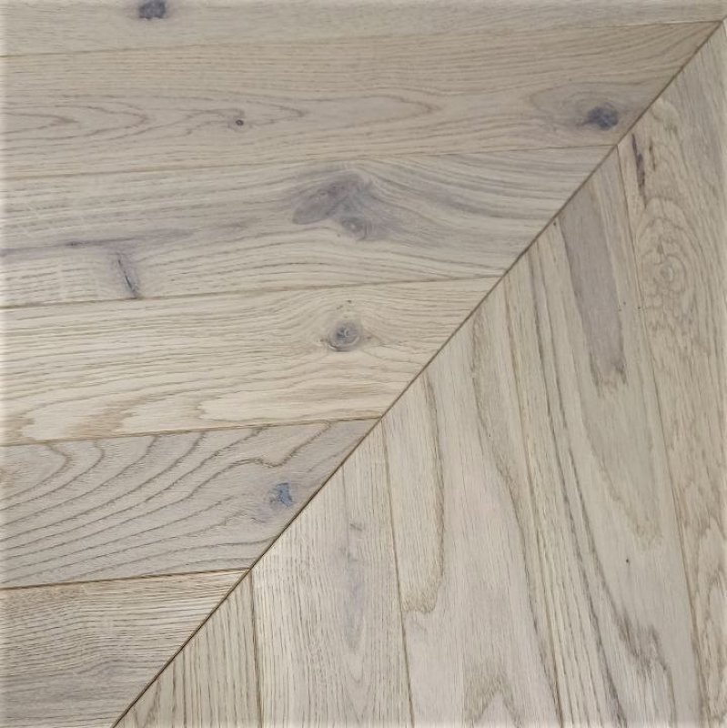 Dąb Bero (Chevron – jodełka francuska) Olejowosk, Szczotkowanie, Fazowanie V4 Wymiary: 405x65x10,5/2,5(+/-0,5) mm
